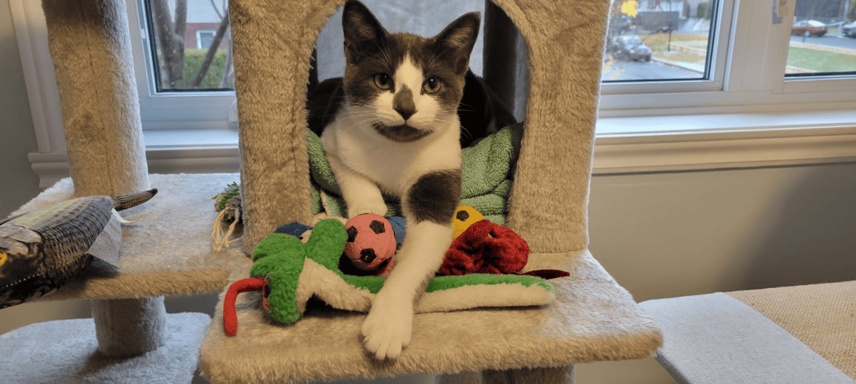 Aujourd’hui, Poupou est une jeune chatte curieuse, intelligente et attachante, qui aime la présence humaine. Elle joue avec enthousiasme, adore les cannes à pêche, les balles et les vidéos d’oiseaux, et vient volontiers chercher de l’attention. Elle se laisse flatter, ronronne, tourne autour des jambes et peut même venir s’installer sur les genoux — encore un peu maladroitement, mais avec un cœur rempli de confiance!