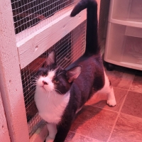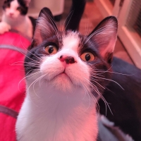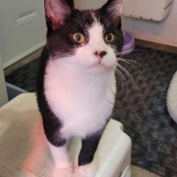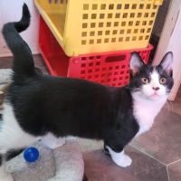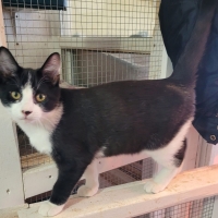Rock est un adorable chaton noir et blanc à poil court avec de magnifiques yeux jaunes dorés. Il est vraiment craquant avec son petit nez avec des taches noires et ses belles longues moustaches!
