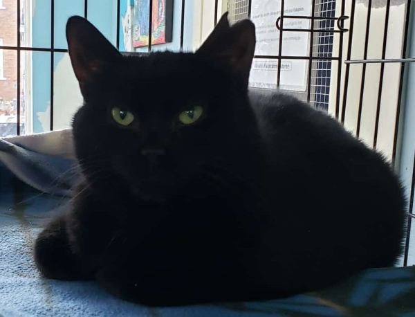 Sharpie est une femelle au poil court noir de presque 3 ans.