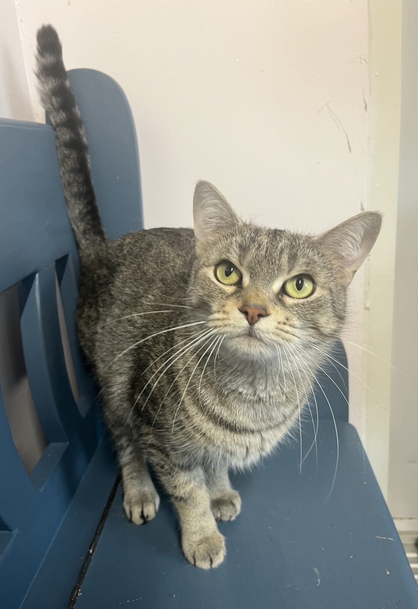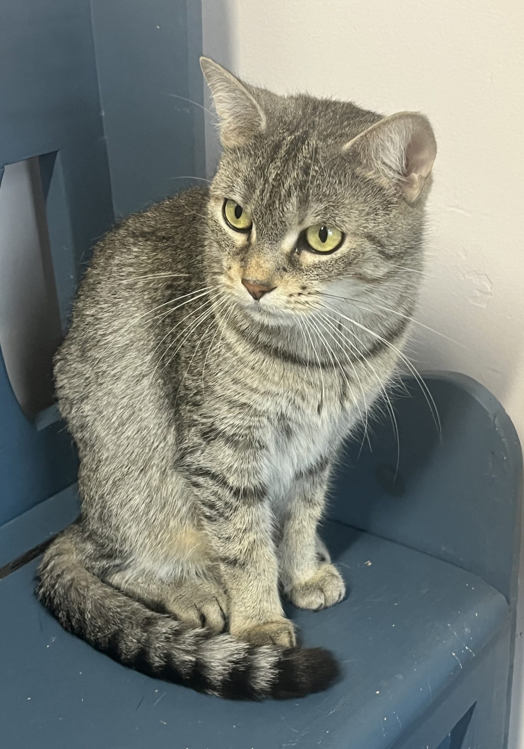 Sierra est une chatte élancée et agile des plus attrayantes avec son élégant pelage tabby gris-argenté et ses sublimes yeux verts au regard rempli d’intelligence. Elle est excellente santé.