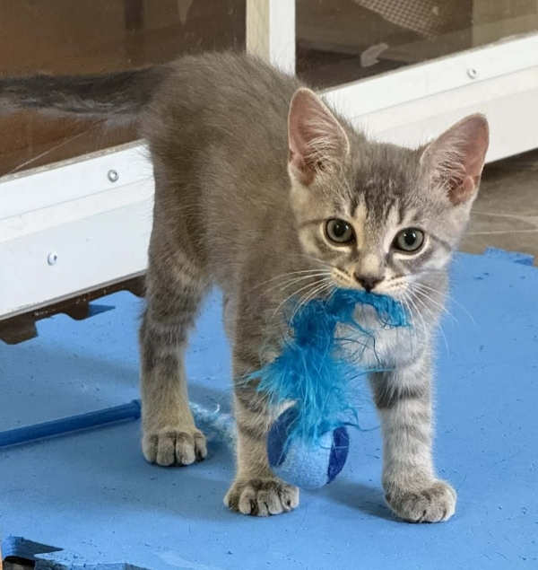 un chaton mâle à poils courts et de couleur tabby gris d’environ 3 mois.
