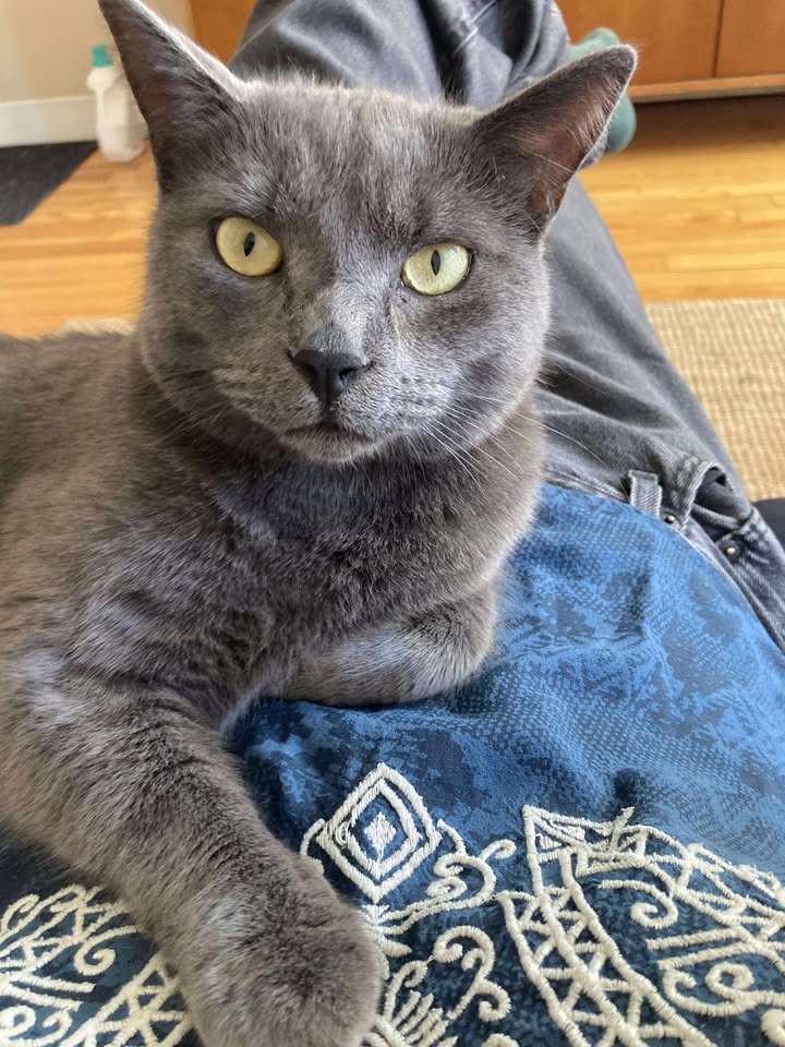 Un magnifique mâle gris bleu à poil court âgé de 3 ans. Il a été trouvé errant à Québec.