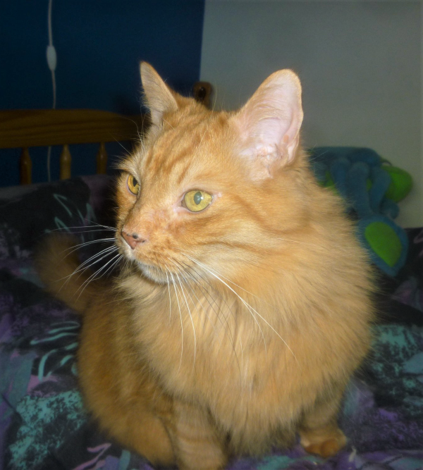 Un beau grand garçon âgé de 11 ans très affectueux qui s’adapte facilement aux gens. Ti-Roux ronronne aussitôt qu’on le touche et aime bien jaser, sauf la nuit, il est silencieux. Il s’entend bien avec les autres chats, il aime leur compagnie.