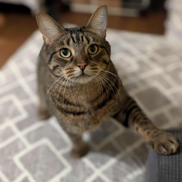 Tiger Fluff est un magnifique chat au pelage brun tigré, plein de caractère et d’aventure! Derrière son air parfois farouche, se cache un compagnon incroyablement attachant et affectueux pour ceux qui prennent le temps de le connaître.