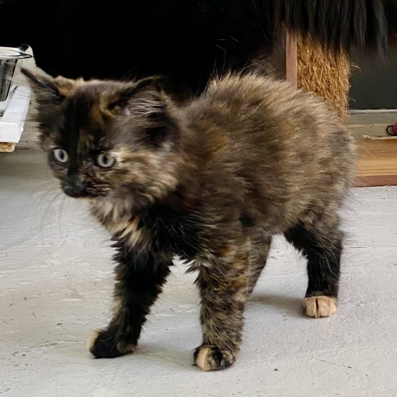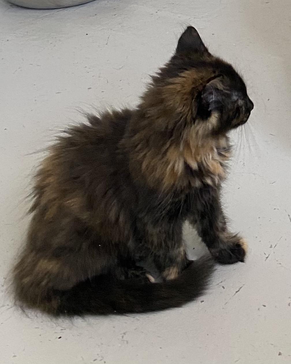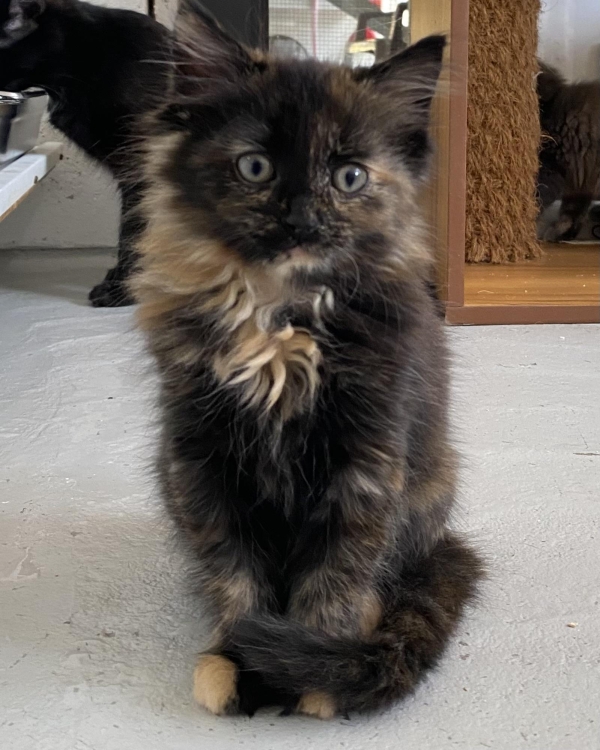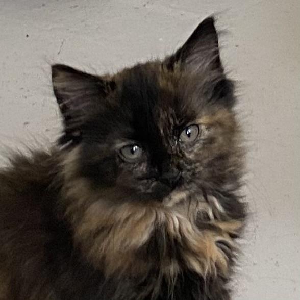 une magnifique chatonne écaille de tortue à poil mi-long âgée d’environ 3 mois. Elle a récemment été amenée au refuge avec sa mère Suki, son frère et ses sœurs, qui sont également disponibles à l’adoption.