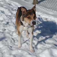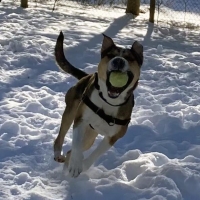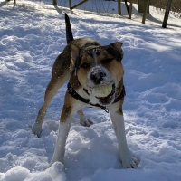 Bear déborde d’énergie et adore s’amuser, que ce soit en courant dehors dans la neige, en poursuivant sa balle, ou en jouant avec des jouets qui couinent.