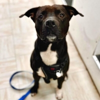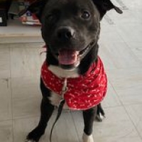 Un adorable mâle de type Staffordshire Terrier croisé âgé de 5 ans.