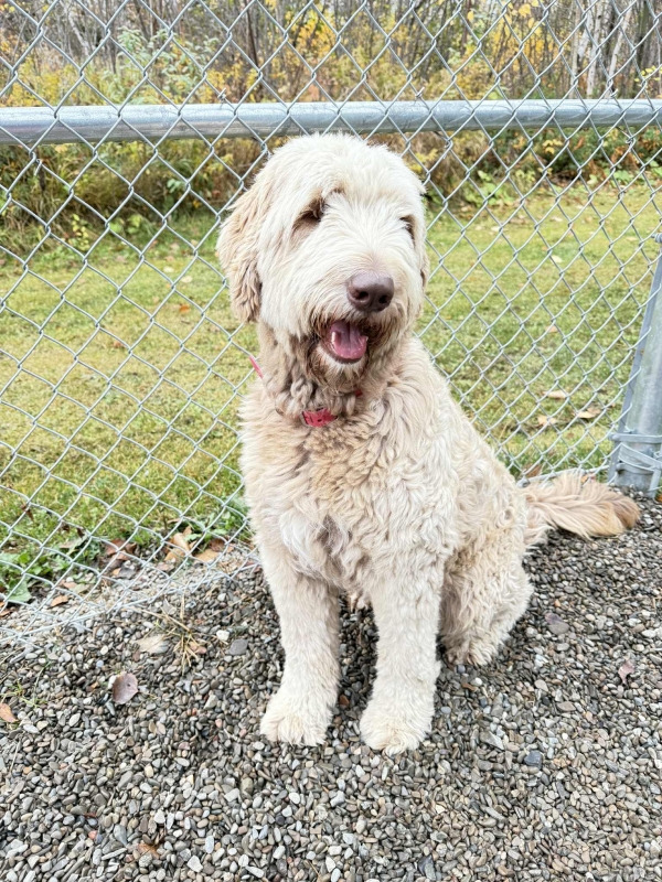 Une ravissante femelle de type Caniche croisé âgée d’environ 3 ans.