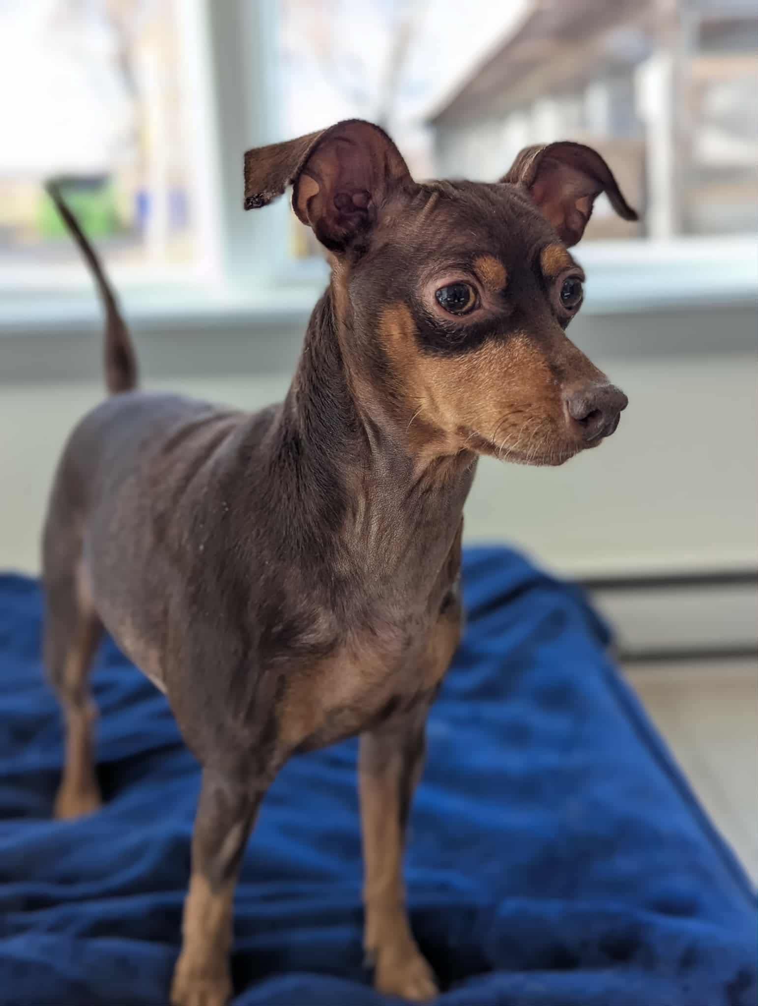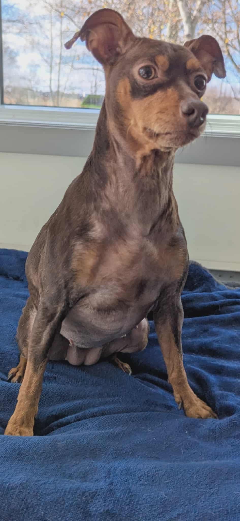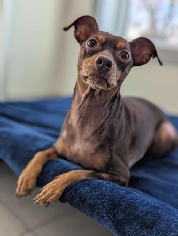 Une superbe femelle de type Pinscher âgée de 7 ans et pesant 10 lbs.