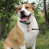Un beau mâle de type Labrador croisé Pit bull âgé de 3 ans pesant 37 kg.