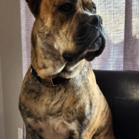 Un charmant mâle âgé de 2 ans de race Bouledogue Américain croisé Boxer et pesant 95 livres.