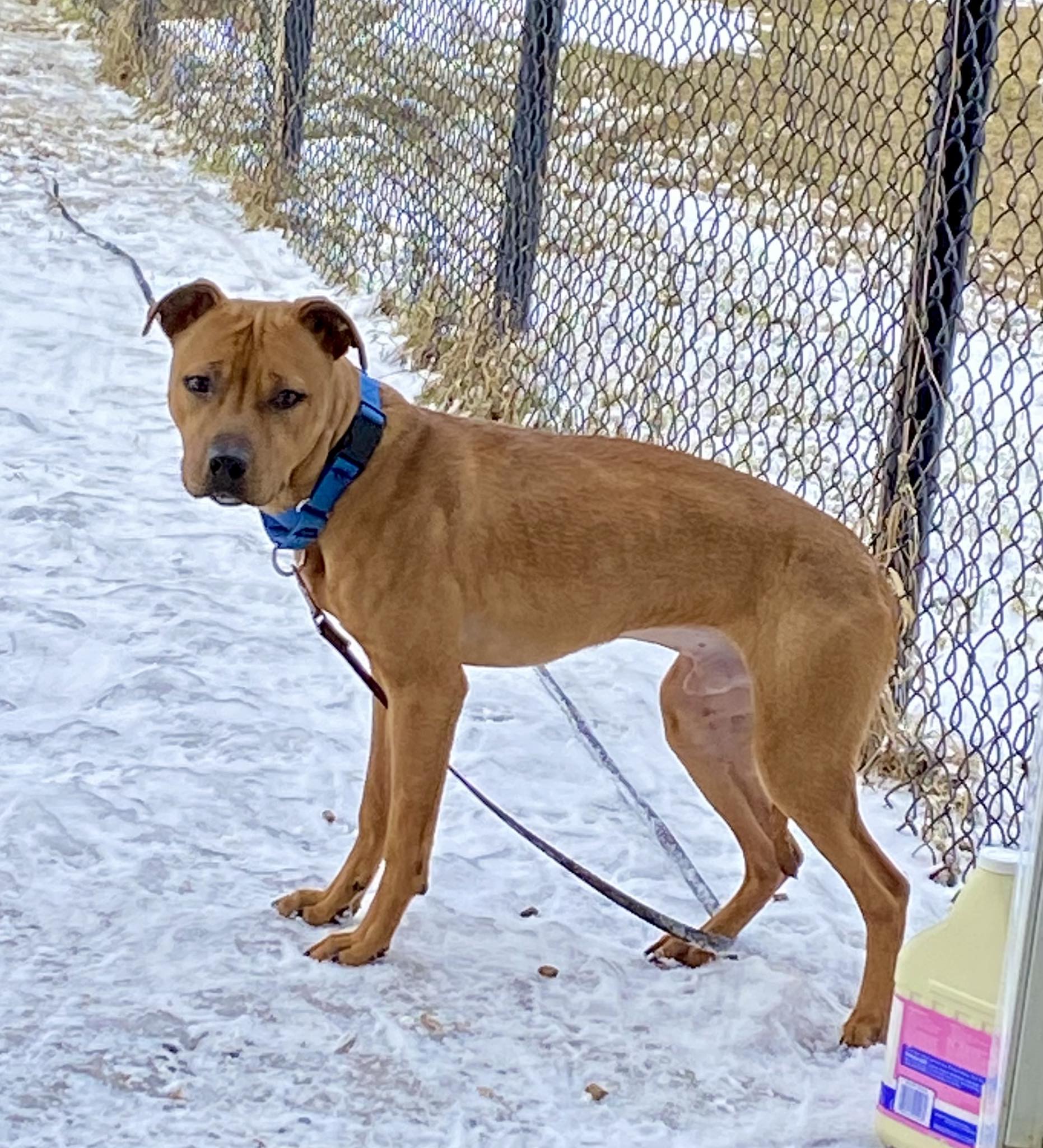 Un joli mâle de type Pitbull croisé âgée de 8 mois et qui pèse 15.2kg.