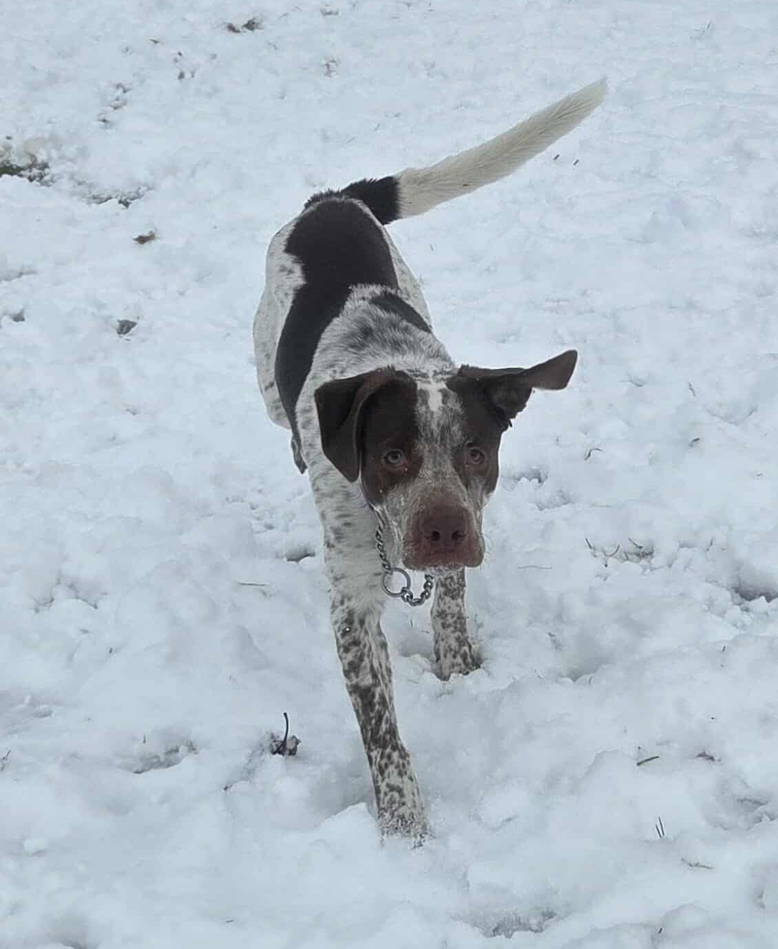 Je suis un jeune braque trouvé errant, dont on ne connaît pas le passé, mais je me suis rapidement révélé comme l’un des chiens les plus sociables du refuge. J’apprécie énormément la présence humaine et me montre toujours heureux d’interagir. J’ai aussi une façon bien à moi d’exprimer ma joie : lorsqu’on me caresse, je m’agite tellement que ma queue tape contre mes flancs — une petite « danse » qui en dit long sur mon enthousiasme.
