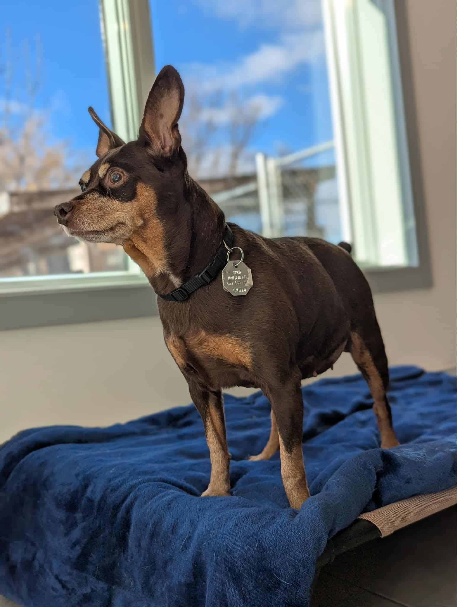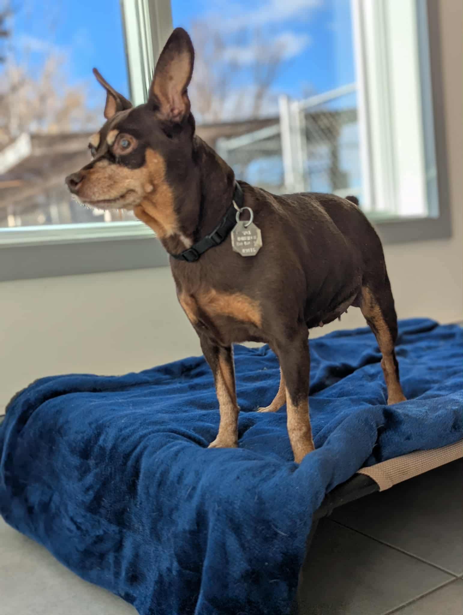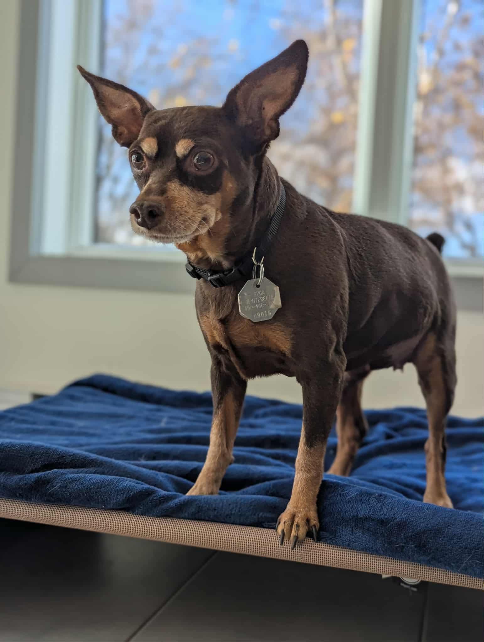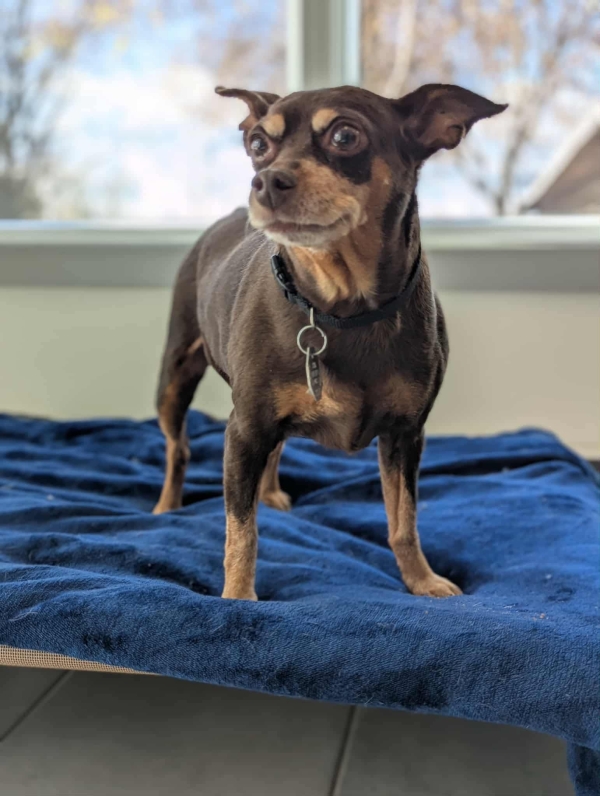 Une magnifique femelle de type Pinscher âgée de 10 ans et pesant 10 lbs.