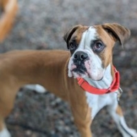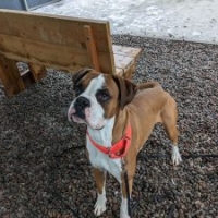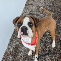U magnifique jeune mâle de type Boxer croisé âgé de 2 ans et pesant 25 kg.