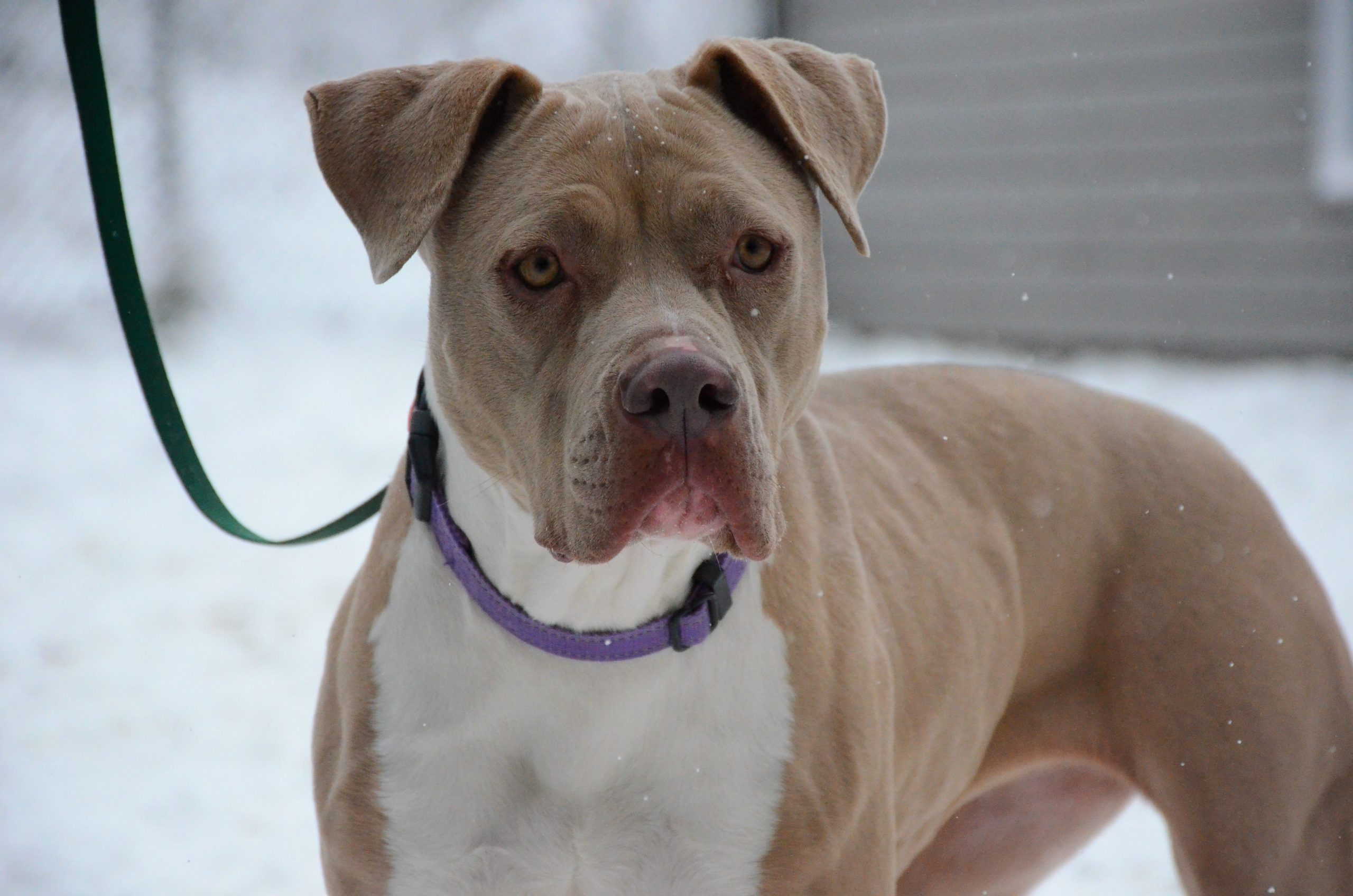 Une jolie femelle de type Pitbull croisée âgé de 1 an et qui pèse 22.2kg.