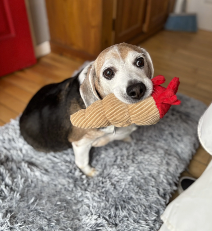 Jake est arrivé à Rescue All Dogs (RAD) après avoir été sauvé d’une situation de grave négligence. Il était enfermé dans un sous-sol et nourri de manière excessive jusqu’à ce que son poids atteigne près de 45 kg, soit plus de trois fois le poids normal d’un beagle ! En raison de cette négligence prolongée et de son obésité extrême, Jake souffrait de problèmes cutanés et de difficultés motrices qui limitaient son confort et ses mouvements. Malgré tout ce qu’il a enduré, Jake a conservé sa douceur d’esprit. Il est désormais en sécurité et commence son chemin vers une vie plus saine.
