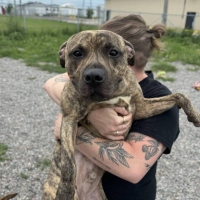 Un magnifique mâle de type Pit bull âgé de 1 an. Il pèse 21,3 kg.