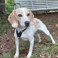 Une adorable jeune femelle de type Beagle croisé âgée de 1 an et pesant 20 livres.