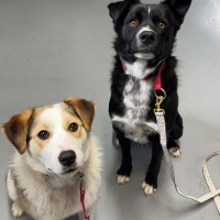 Un superbe duo composé d’une femelle de type Berger australien croisé âgée de 7 mois et d’un mâle de type Border Colley croisé âgé de 1.5 an.