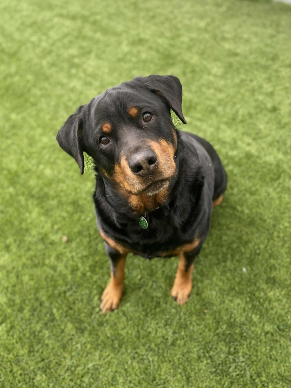 une magnifique rottweiler de 4 ans et 10 mois, une grande fille au cœur tendre et au regard rempli de douceur.