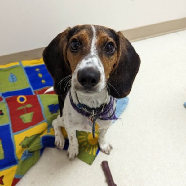 Une adorable jeune femelle de type Beagle croisé âgée de 6 mois.