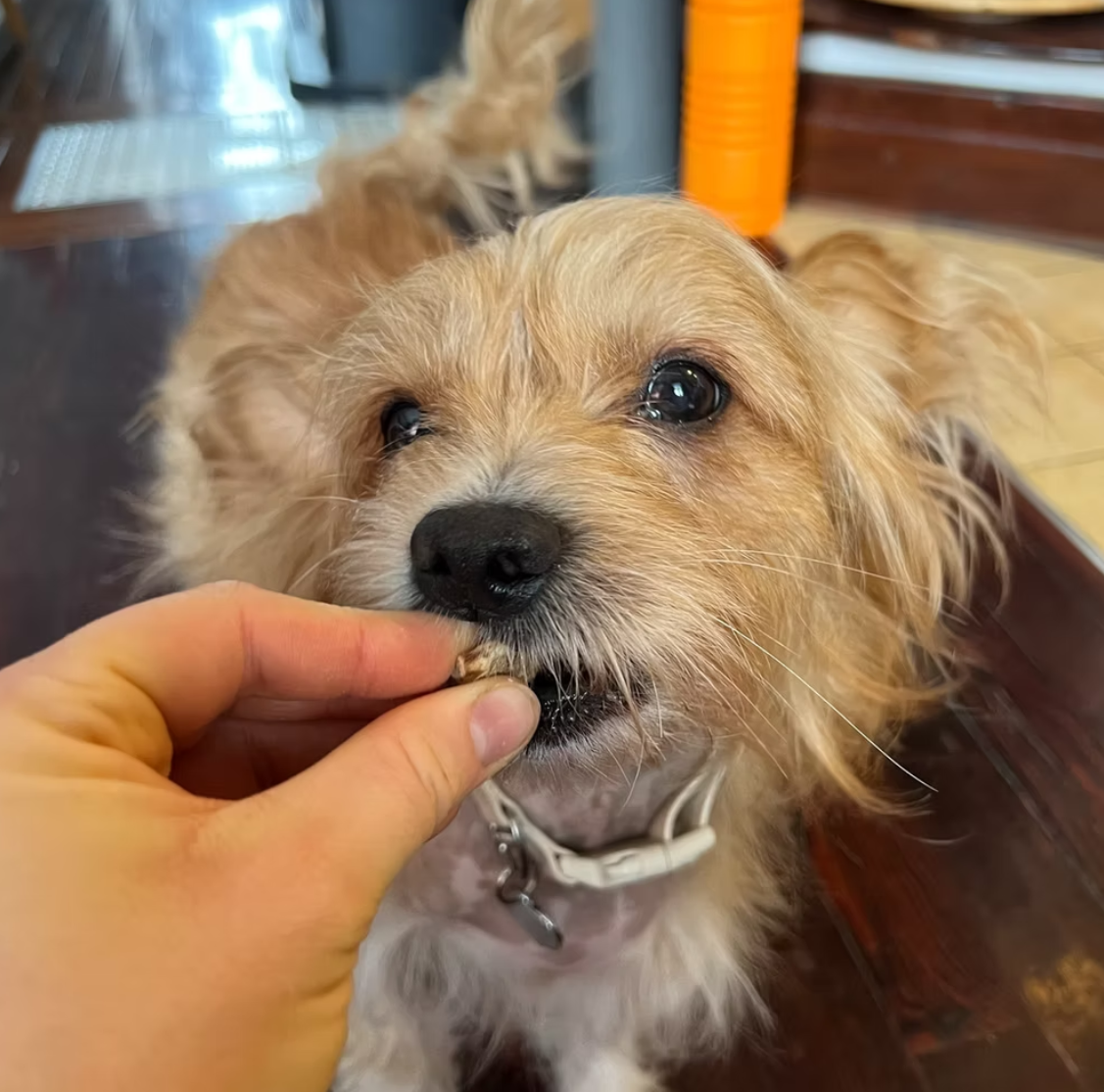 En laisse, je marche généralement bien, mais il peut m’arriver de japper après certains hommes ou certains chiens. Ce n’est vraiment pas avec tout le monde, et c’est parfois difficile de prévoir quand je vais réagir. Je suis un peu peureux avec les messieurs. Quand je suis trop stimulé, je peux aussi faire un petit “snap”, donc le mieux est de me rediriger sur un os ou un jouet dans ces moments-là. Ah, et petit défaut : je suis un voleur de nourriture professionnel. Je saute sur toutes les occasions, et je supplie quand vous mangez, même si on ne m’a jamais donné de nourriture de table (je garde espoir !).
