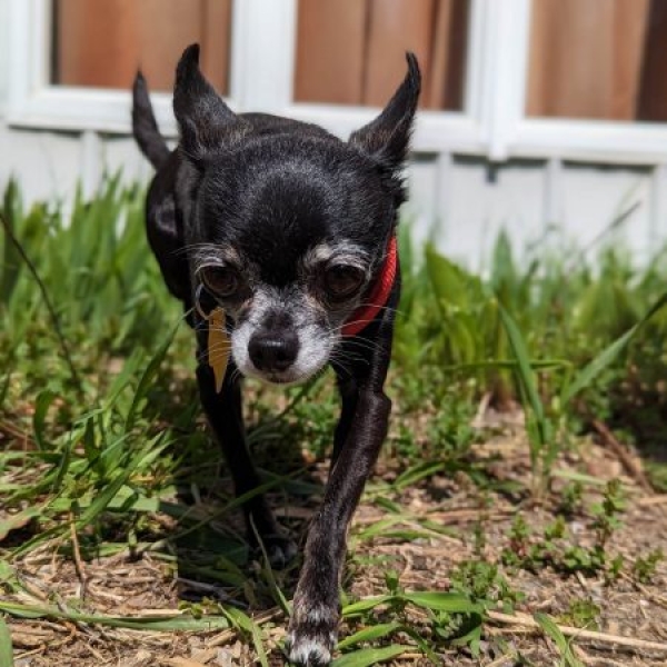 Une gentille femelle d’expérience de type Chihuahua croisé âgée de 10 ans et pesant 2 kg.