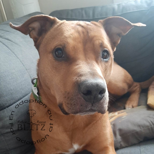 Un superbe mâle de type Pittbull croisé Boxer âgé de 4 ans, aimant et attachant qui attend impatiemment sa famille pour la vie.