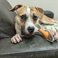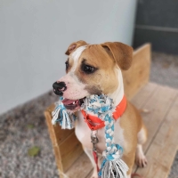 Momoush est un chien unique avec son propre style de jeu. Il adore se balader avec un jouet, ou n’importe quoi qu’il puisse mettre dans sa gueule, surtout lorsqu’il rencontre de nouvelles personnes. Il joue régulièrement avec un golden retriever au refuge, mais il pourrait avoir du mal à comprendre les limites des autres chiens qui souhaitent moins jouer.
