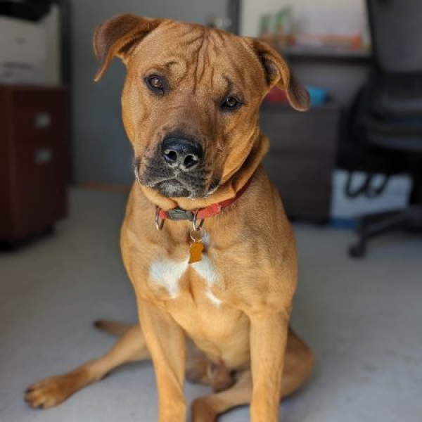 Un magnifique jeune mâle de type Mastiff croisé âgé de 1 an et pesant 33 kg.