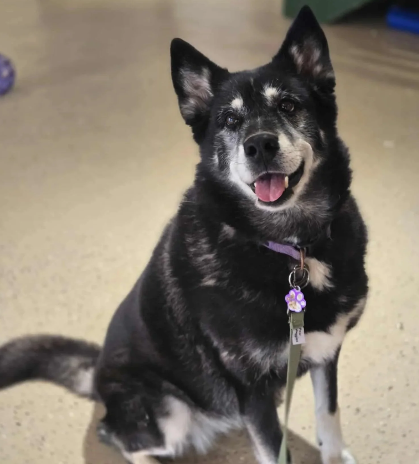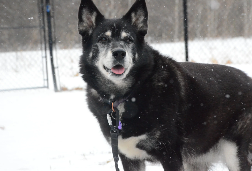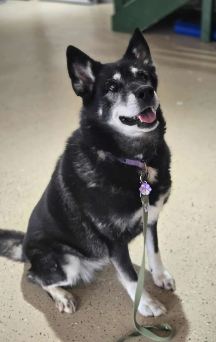 Une superbe femelle âgée de 6 ans et de race croisée Husky. Elle présente un niveau d’énergie moyen et est de grande taille (environ 36kg, mais devrait être plus près du 32kg).