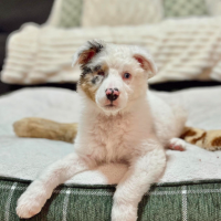Une adorable jeune femelle de type Berger australien croisé âgée de 4 mois et pesant 13 livres.