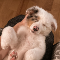 Comme je suis sourde, mon éducation est un peu différente puisque je dois apprendre le langage des signes. Cela n’est pas toujours facile pour un jeune chiot comme moi, mais avec des friandises (et de la patience), j’y arrive! Un de mes yeux est aussi atteint de la microphtalmie, une condition génétique où les globes oculaires ne se développent pas correctement. Pour l’instant, mon état ne me cause pas de douleur. Par contre, si mes yeux présentent des sécrétions, des rougeurs ou des inconforts dans le futur, il sera important de consulter un vétérinaire.
