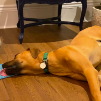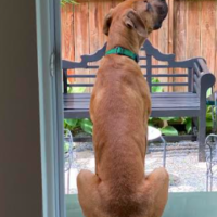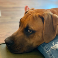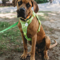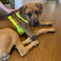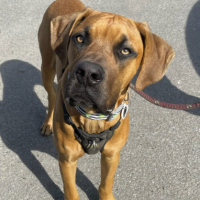 Un magnifique mâle âgé de 8 mois, de grande taille (environ 85 lbs) et présentant un niveau d’énergie moyen. Il est de race croisée grand danois, mastiff et chein de Rhodésie.