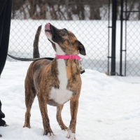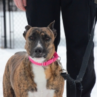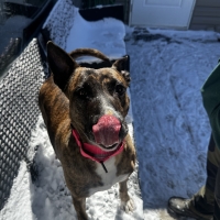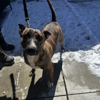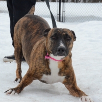 Une jolie femelle de type Pit Bull croisé âgée de 3 ans et qui pèse 18kg.
