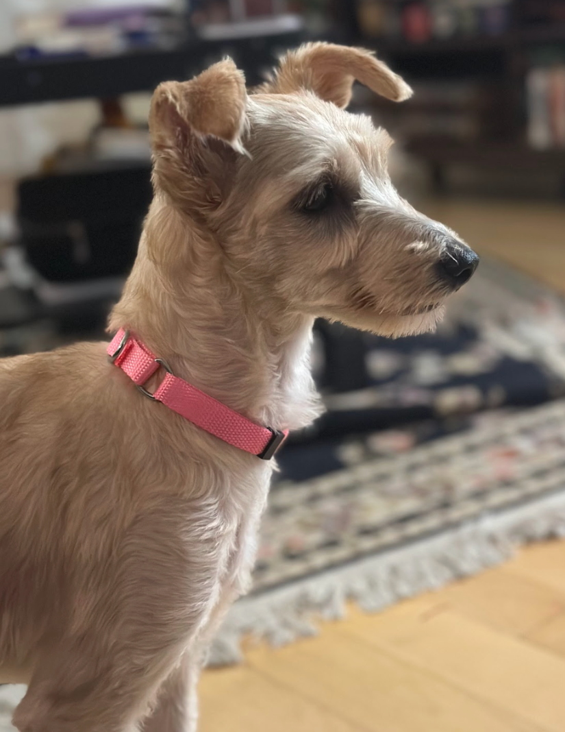 Elle est maintenant capable d’utiliser les escaliers. Elle comprend de plus en plus le « viens » et le « assis » lorsqu’on lui propose des gâteries. D’ailleurs, elle adore manger! Que ce soit des croquettes, des friandises, des trucs à mastiquer ou un tapis de léchage, elle est toujours enthousiaste! Il sera donc facile de lui apprendre plein de trucs! N’oubliez surtout pas les jouets et trucs à mastiquer, car sa poussée dentaire la portent à se rabattre sur autre chose si elle n’a rien à se mettre sous la dent.
