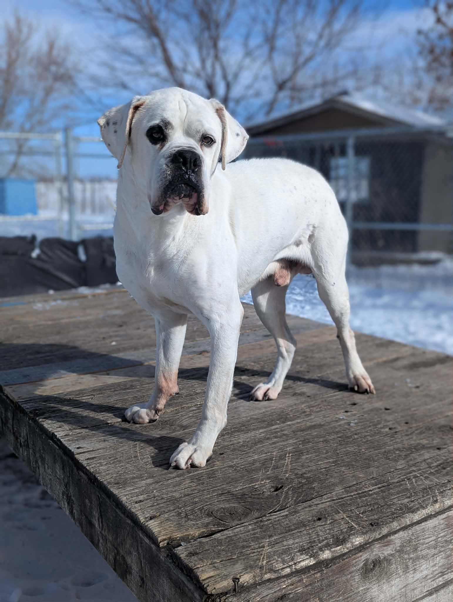 Une jolie femelle d’expérience de type Boxer croisé âgée de 10 ans pesant 20 kg.