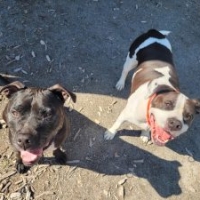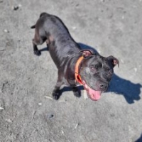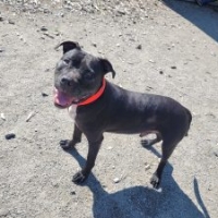 Un adorable mâle d’expérience de type Américain de Staffordshire croisé âgé de 10 ans et pesant 33 kg.