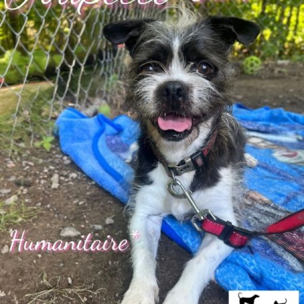 Toupette est en adoption humanitaire, puisqu’elle a un souffle cardiaque et une douleur aux hanches.