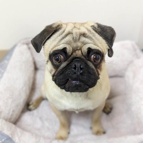 Un charmant jeune mâle de type Carlin croisé âgé de 9 mois et pesant 9 kg.