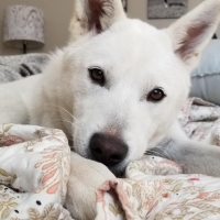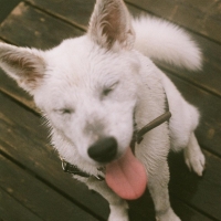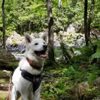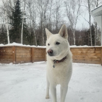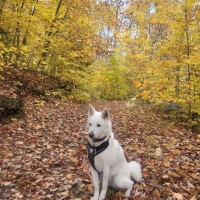 Une jolie femelle de type Jindo croisé âgé de 6 ans et qui pèse 21 kg. Elle est née au Québec mais sa maman est une rescapée du commerce de viande canine en Corée du Sud.