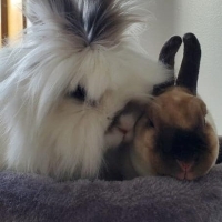Un super duo de femelles de taille petite/moyenne, de race Mini-Rex et Tête de lion, nées respectivement le 7 juin 2016 et le 1er décembre 2017.