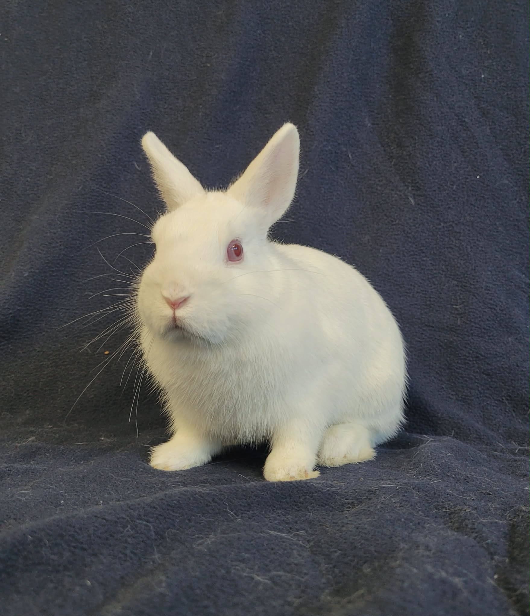 Son joli pelage blanc attire les regards et reflète sa douceur. Elle est très gentille et aime qu’on prenne soin d’elle, mais comme beaucoup de jeunes lapins, elle peut parfois être un peu nerveuse.