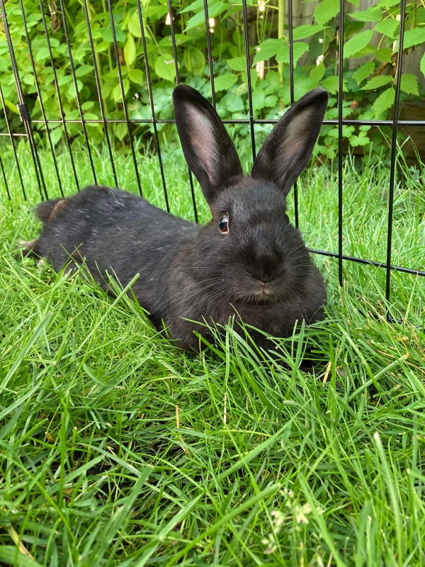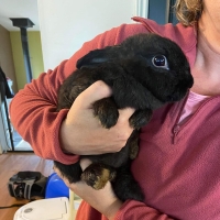 Une jeune femelle de race mixte pesant 4lbs qui vient de l’abandon de 30 lapins devant le CHUV.
