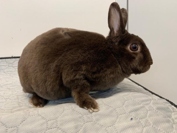 une adorable lapine d’un an au pelage Rex brun, pleine de charme mais au caractère délicat.