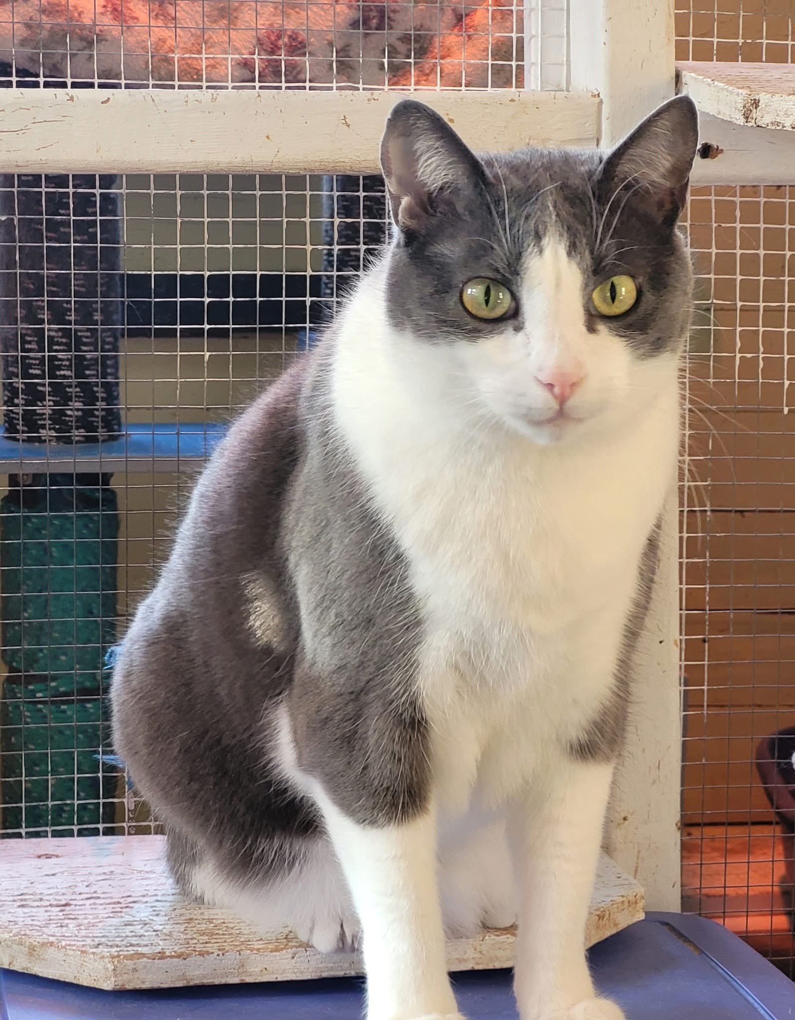 Une superbe femelle grise et blanche poil court âgée d’environ 4 ans.