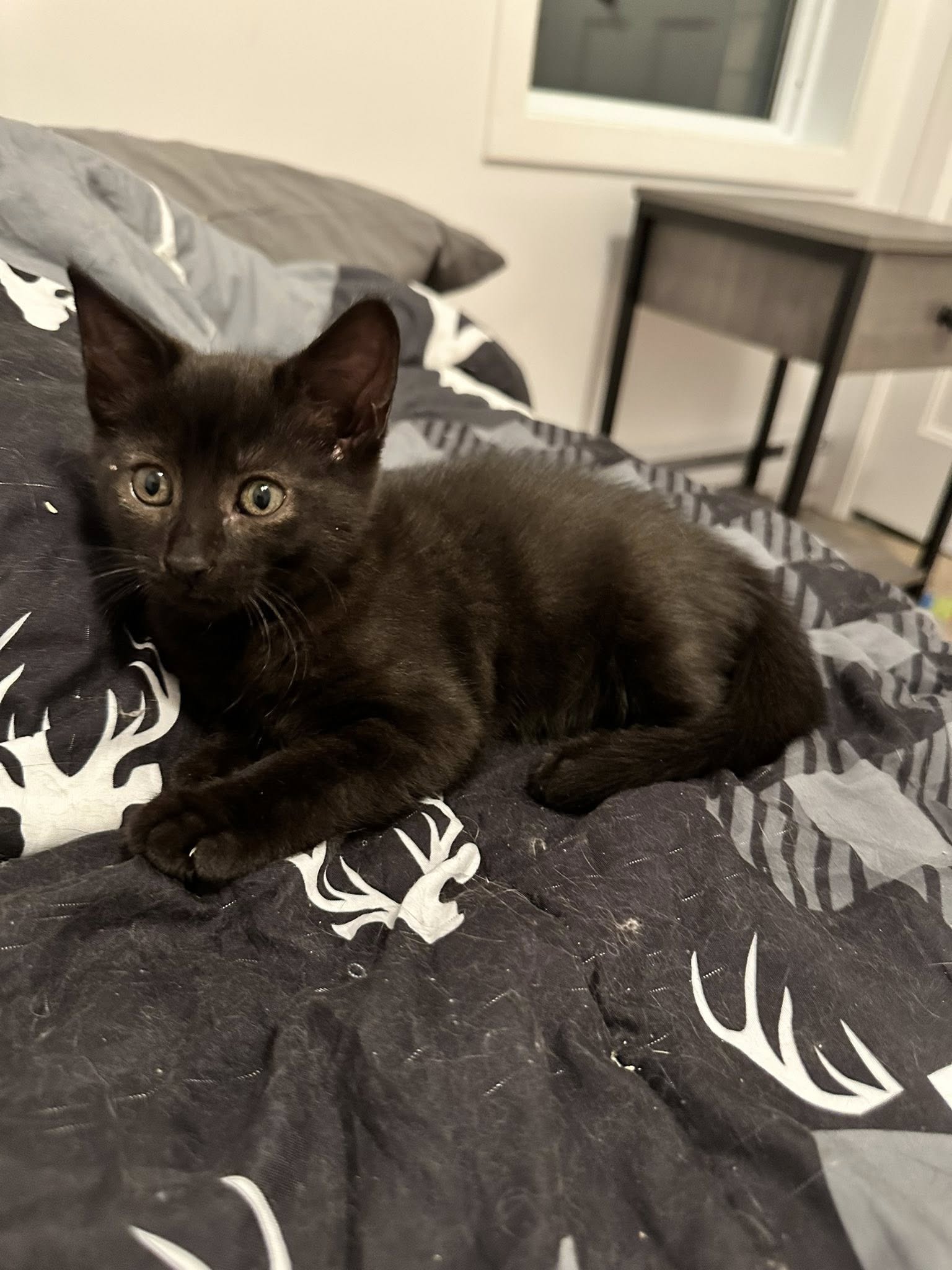 Mariette a été récupérée errante avec sa maman. Mariette est une chatte plutôt indépendante même si elle aime les câlins mais elle est super joueuse. Son surnom? Petite chauve-souris...