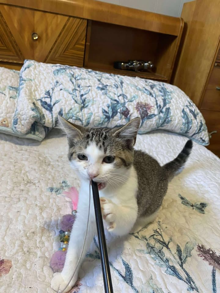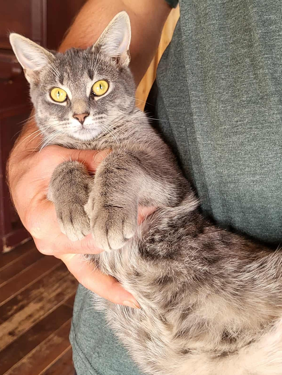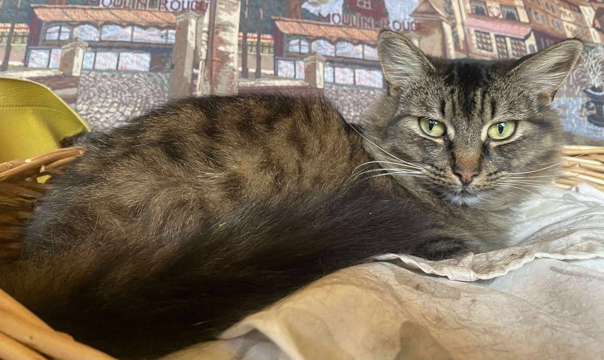 Cette belle chatonne polydactyle (à mitaines) est âgée d’environ 6 mois. Elle est très curieuse et présente dans le quotidien des humains qui partagent son espace de vie.