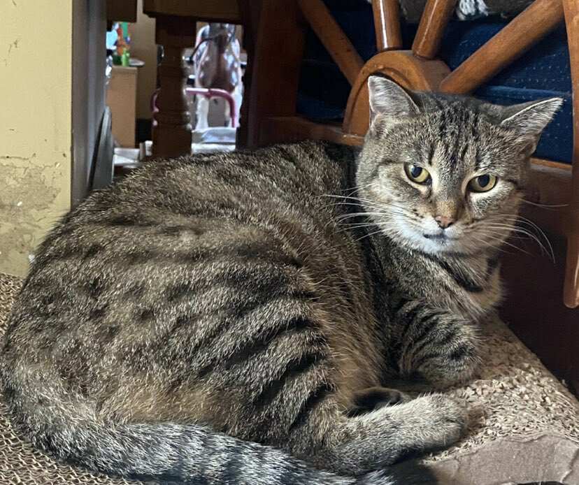 Cette belle chatonne polydactyle (à mitaines) est âgée d’environ 6 mois. Elle est très curieuse et présente dans le quotidien des humains qui partagent son espace de vie.